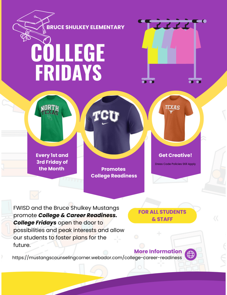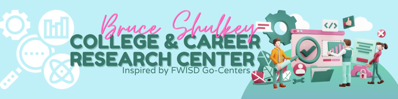 Inspired by FWISD Go-Centers, Bruce Shulkey's College & Career Research Center will allow students to research the top Texas colleges and selected FWISD Gold-Seal Program career fields throughout the school year. Our students will be equipped with information to assist in early college and career interests. Students will be assisted by Mrs. Sanders, school staff, mentors from higher education institutions, and the community.